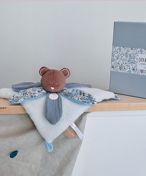 • Doudou présenté dans une boîte fleur suprise, on peut y insérer des souvenirs de bébé ! (photos, souvenirs de la naissance de bébé)